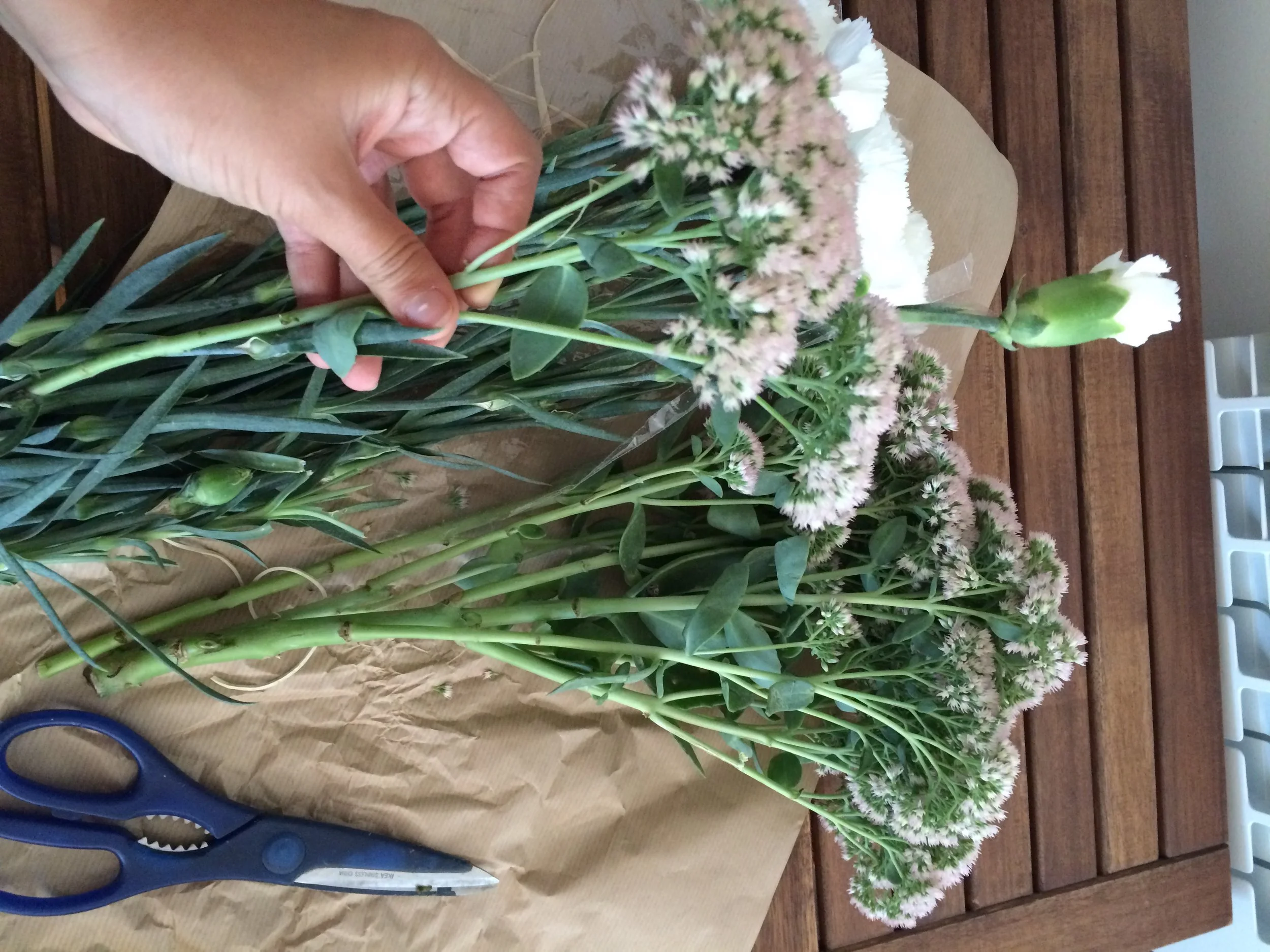 Quando as flores chegam a casa escolho a jarra para elas. É bom ser rápida, não as deixar fora de água muito tempo. Tiro as folhas dos pés que vão ficar dentro da jarra. Corto-as, mas sem ser demais. Vou pegando em porções pequeninas e dispondo com cuidado. Primeiro as que quero que fiquem mais curtas. Depois as mais altas. Normalmente em menor quantidade.