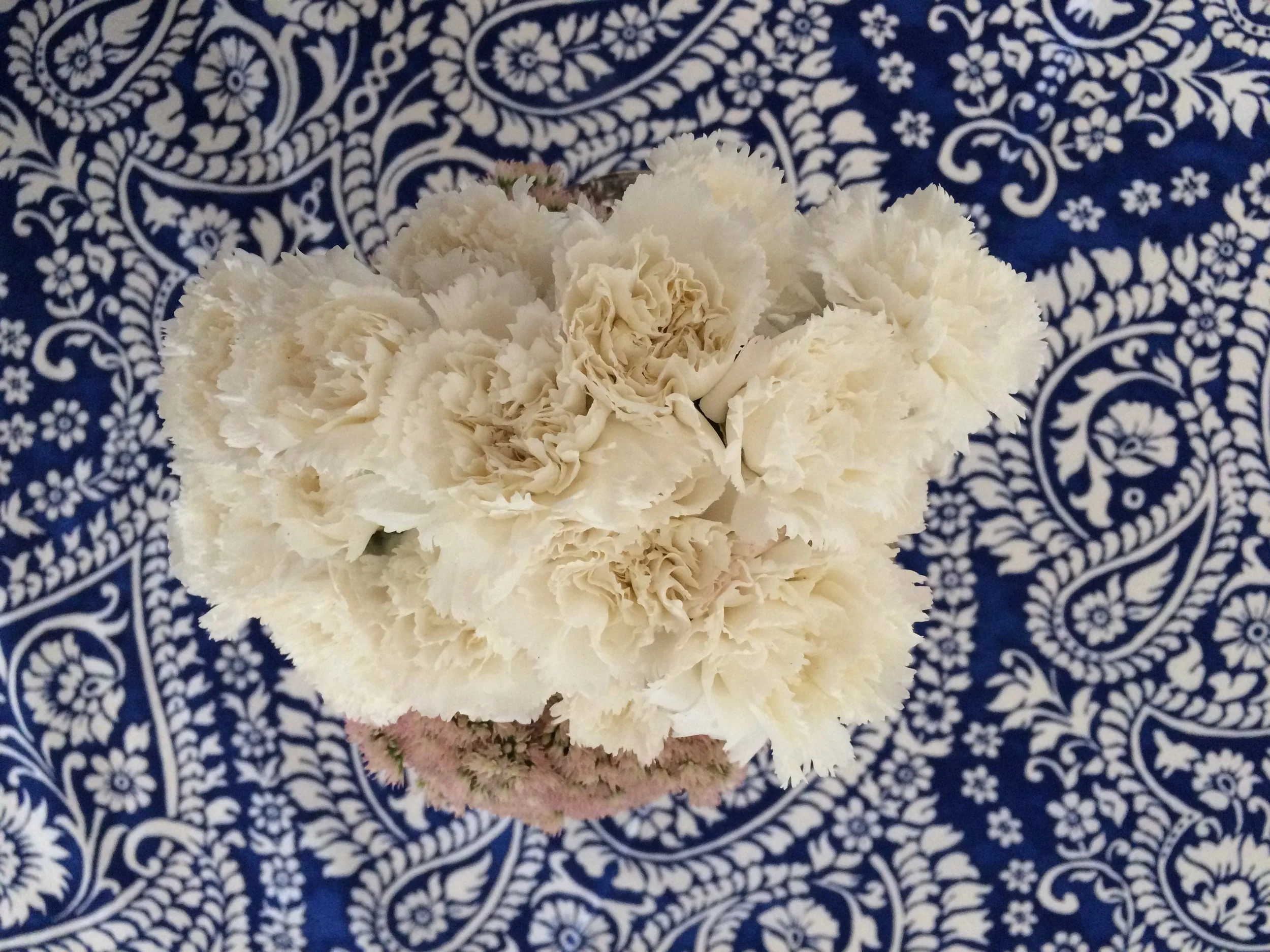 Estes são cravos brancos de um verão em Lisboa. São cravos do mercado da Ribeira que é de onde vêm quase todas as flores lá de casa. É assim que se compram muitas flores sem muito dinheiro. Se quisermos um arranjo bonito também nos fazem. Mas o melhor é comprar flores aos molhos, escolher os molhos mais gordos. Naquele corredor entre os restaurantes e as frutas e os legumes. Há um talho e quatro ou cinco floristas. Já foram mais. Ficaram estas. Algumas com mais paciência para responder às minhas perguntas sobre nomes de flores e truques para as manter vivas. Outras que acham mal eu não levar cores mais vivas e flores mais vistosas. Eu gosto assim.